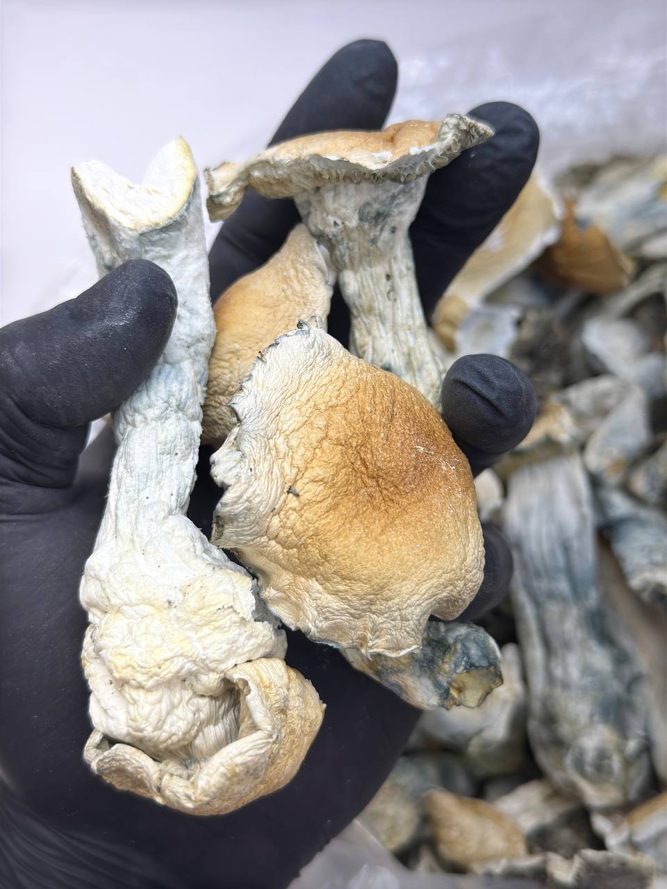Blue Meanie is a popular and potent variety of Psilocybe cubensis, named for its strong blue bruising reaction when handled. The mushrooms typically feature medium-sized golden caps and thick white stems that show deep blue coloration under pressure.
